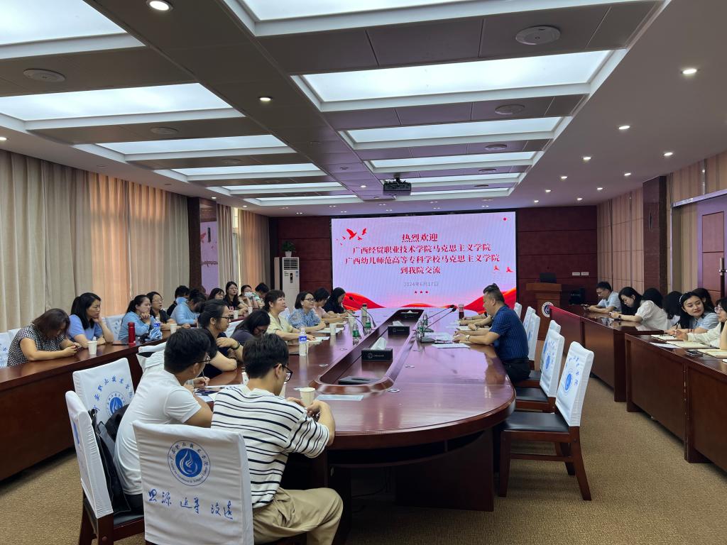 6月17日下午3点,广西幼儿师范高等专科学校、广西经贸职业技术学院九游体育官网一行31人到九游调研交流。九游体育官网直属党支部书记、院长石乾福,副院长汪琦佳,教研室主任戴高蕙及部分思政课教师在春晖楼四楼会议室开展座谈会,会议由石乾福主持。