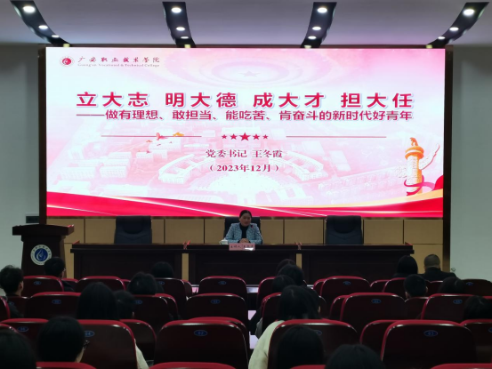 12月13日上午9点30分,校党委书记王冬霞在明德楼希贤厅为2021级电子商务1班和2班学生讲授了一堂题为“立大志、明大德、成大才、担大任”的专题思政课。校党政办、九游体育官网等部分老师参加了学习。