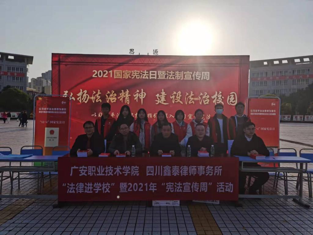 为进一步弘扬宪法精神,增强师生法制观念,提高法律意识,在校营造学习宪法、尊崇宪法、宣传宪法、维护宪法、运用宪法的浓厚氛围,根据学校安排,九游体育官网与四川鑫泰律师事务所携手启动以“习近平法治思想为指引,深入学习宣传宪法”为主题的“法律进校园,我们在行动”宪法宣传周活动。