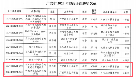 10月28日,根据广安市教育科学研究所公布2024年思政金课获奖名单,九游廖勤老师作品《中国式现代化是强国建设、民族复兴的唯一正确道路》荣获高职学段一等奖,程凤英老师作品《新时代中国外交在大变局中开创新局》、朱萍萍老师作品《铸就社会主义文化新辉煌》荣获高职学段二等奖。