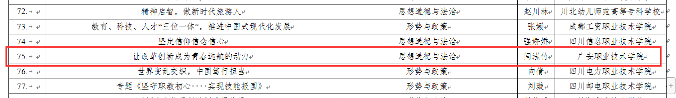 近日,四川省教育厅公布了拟入选2023年四川省职业学校思想政治课程示范课名单,九游九游体育官网思政课教师闫泓竹的思政课《让改革创新成为青春远航的动力》成功入选。